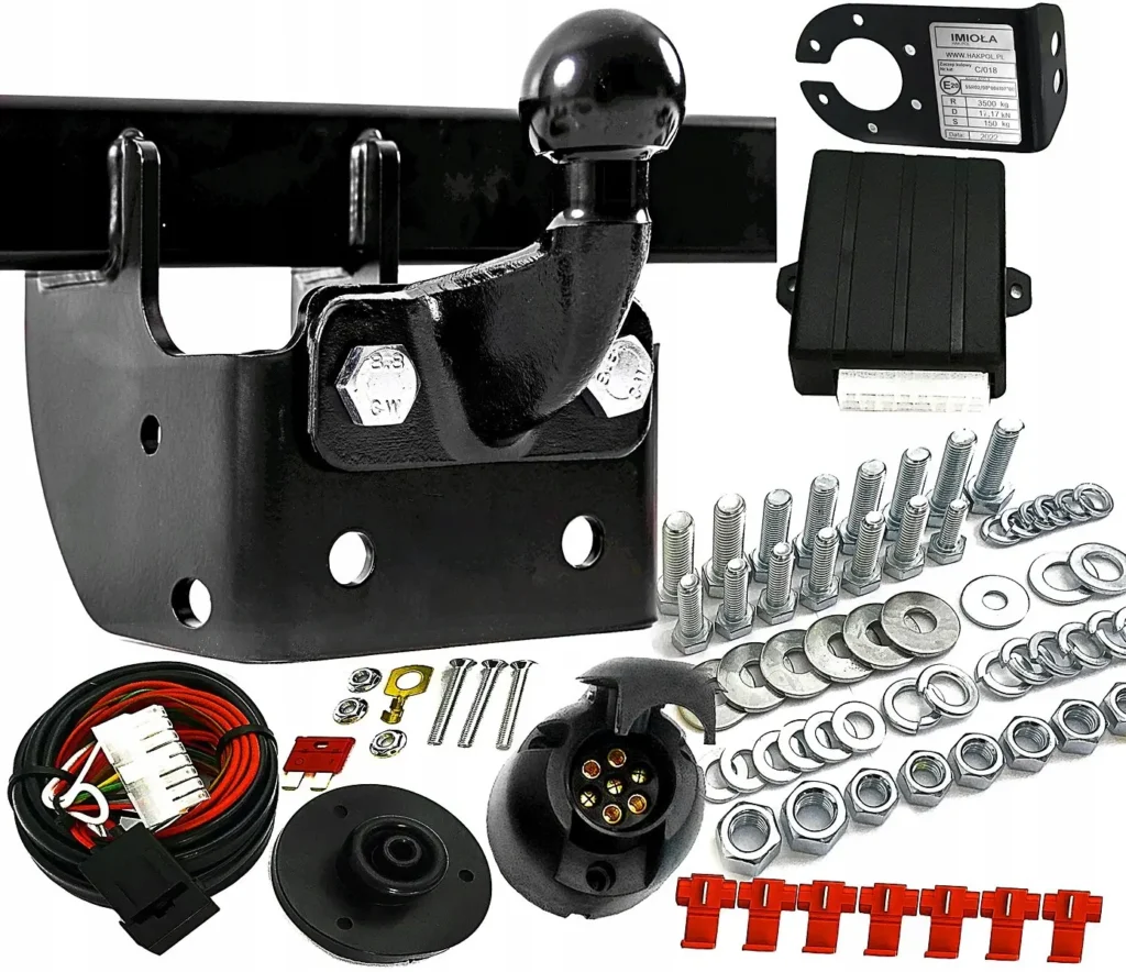 Hak holowniczy z kulą kutą odkręcaną, osłona kuli, komplet śrub i podkładek montażowych, tabliczka znamionowa z numerem homologacji, instrukcja montażu.
